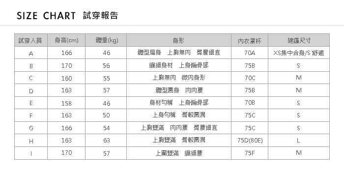 *每個人的身高體重和商品的尺寸不盡對等,身高155CM豐腴與180CM纖 細的女孩也有可能會穿同一個尺寸的商品。