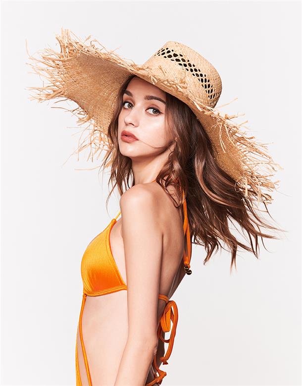 大帽簷款紳士帽型,內圍可用魔鬼簪調整尺寸,拉菲草編織簍空而成,必備海灘單品。