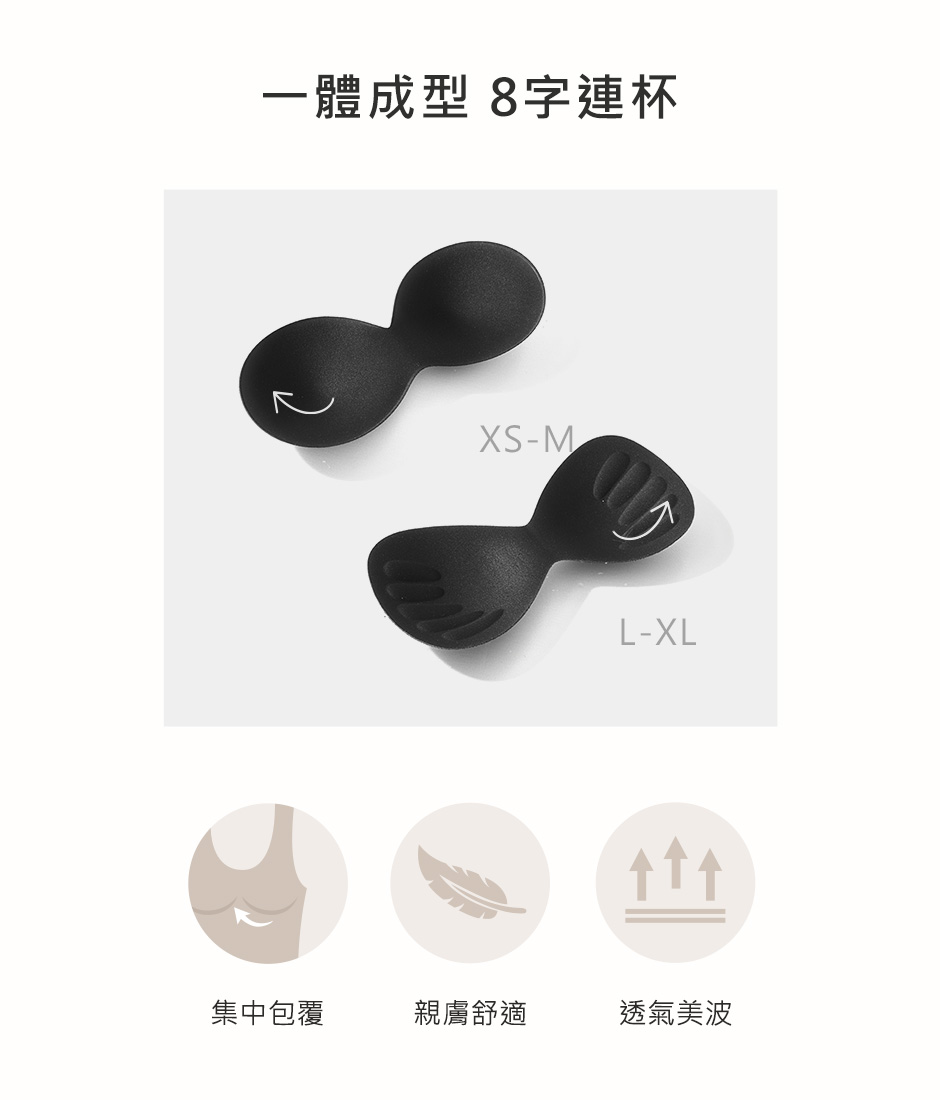 6.尺寸XS~M為集中型厚墊,由厚漸薄杯墊設計,聚攏胸托效果;尺寸L為專屬舒適薄杯,兩側手指枕墊,包覆胸托效果。