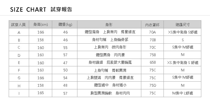 *每個人的身高體重和商品的尺寸不盡對等,身高155CM豐腴與180CM纖 細的女孩也有可能會穿同一個尺寸的商品。