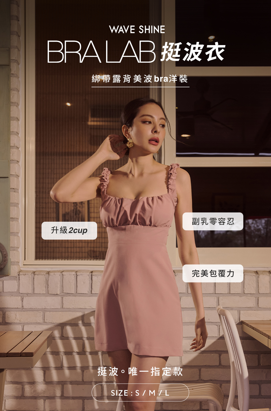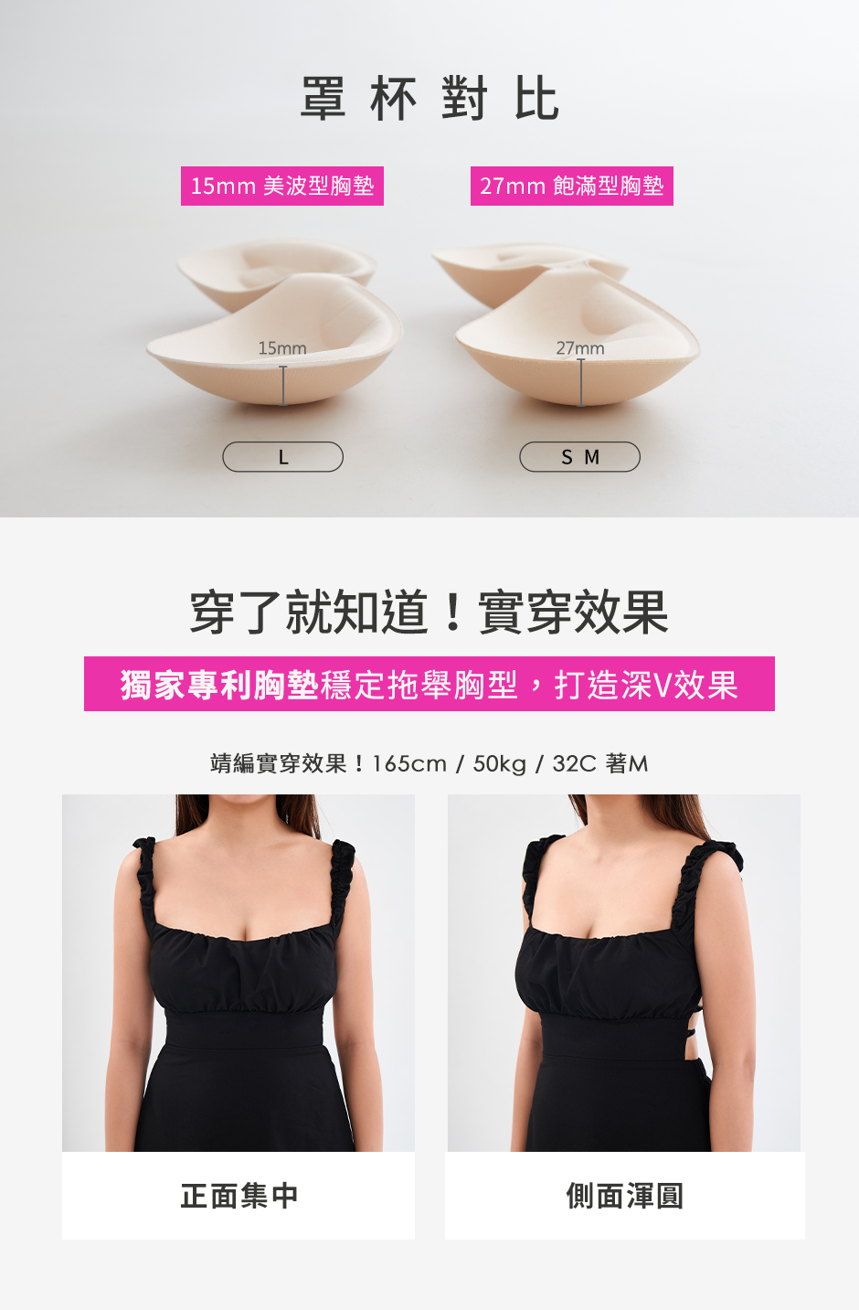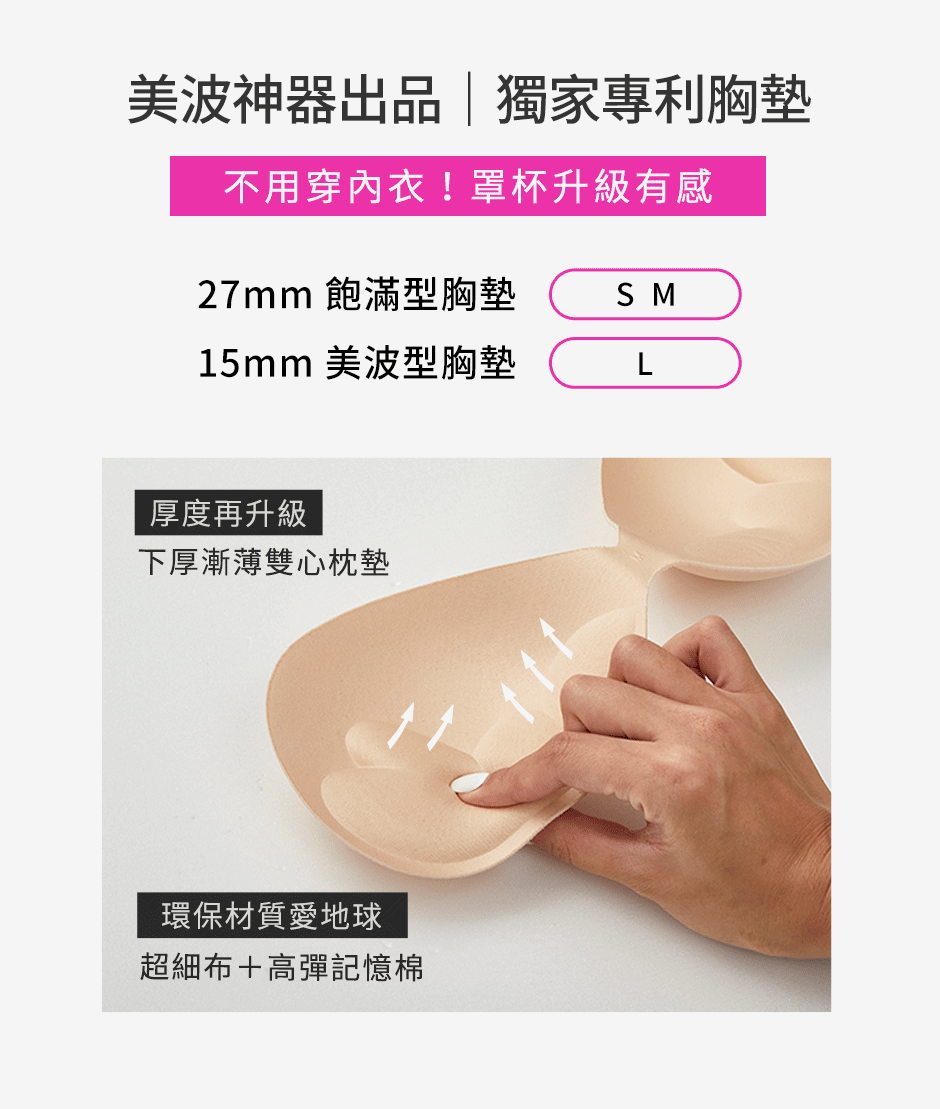 3.各尺碼專屬罩杯,S~M為27mm飽滿型胸墊;L為15mm美波型胸墊。