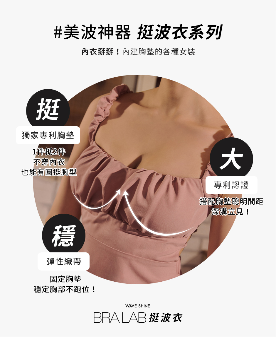 2.內附罩杯為獨家專利環保設計,一體成型雙心提波胸墊,更加提托集中。
