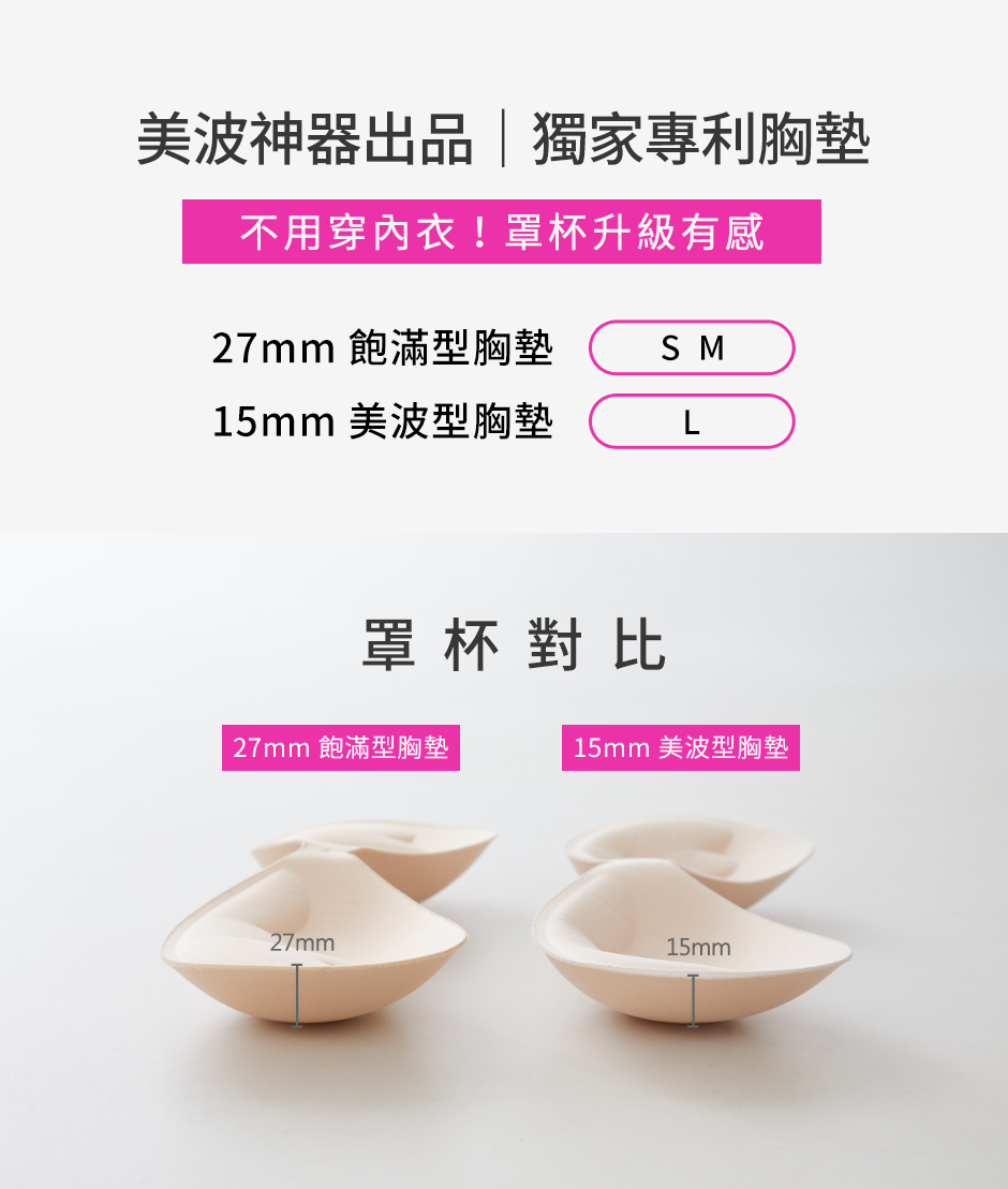 3.各尺碼專屬罩杯,S~M為27mm飽滿型胸墊,L為15mm美波型胸墊。
