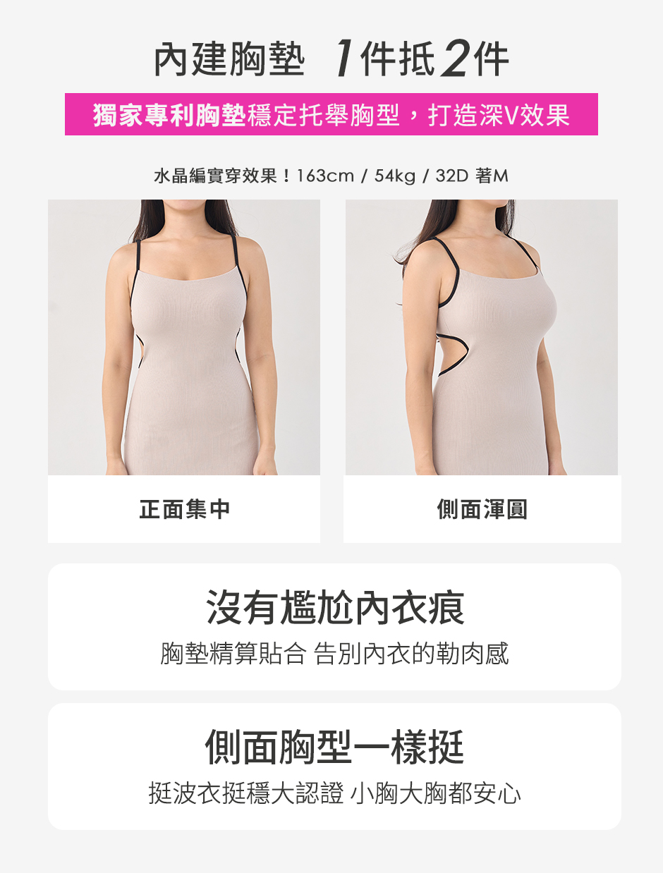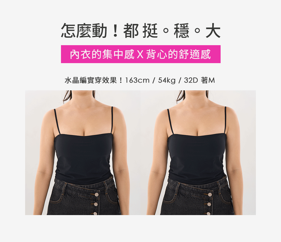 2.內附罩杯為獨家專利環保設計,一體成型雙心提波胸墊,更加提托集中。