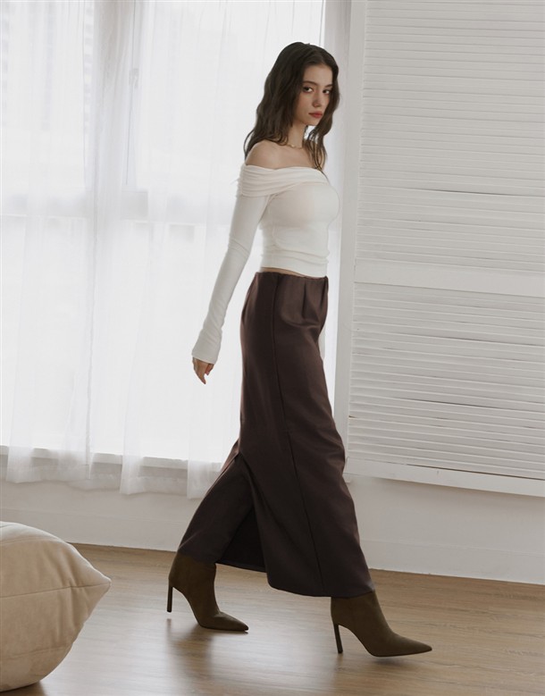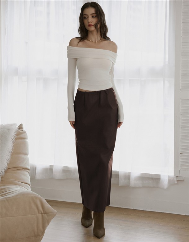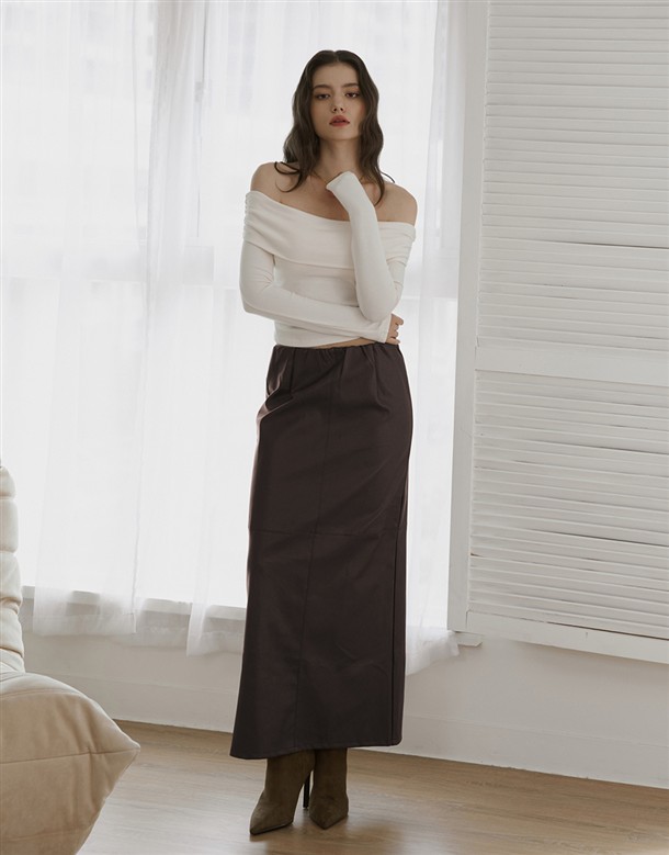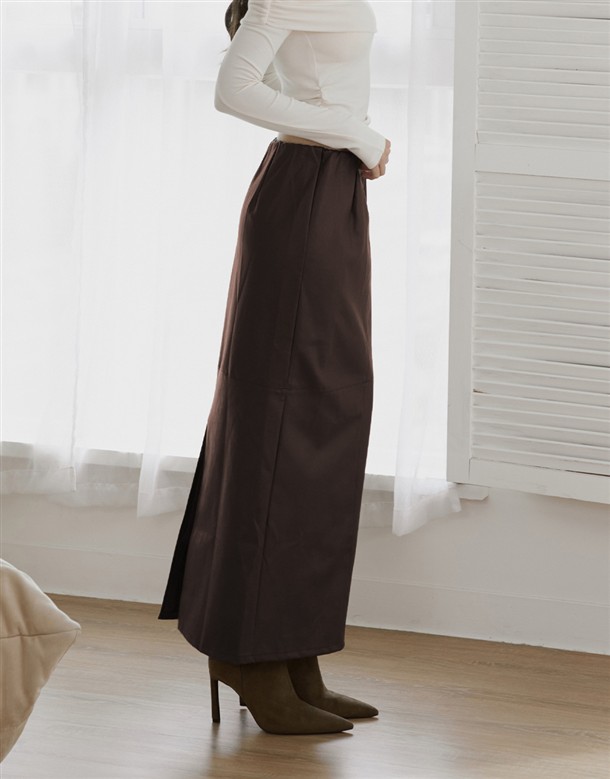 質感合成皮革面料,內刷薄棉,腰頭鬆緊帶設計,版型修身偏直筒小A字,有拼接設計,有內裡,前後兩穿