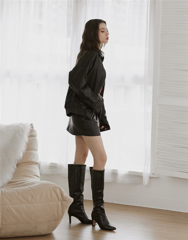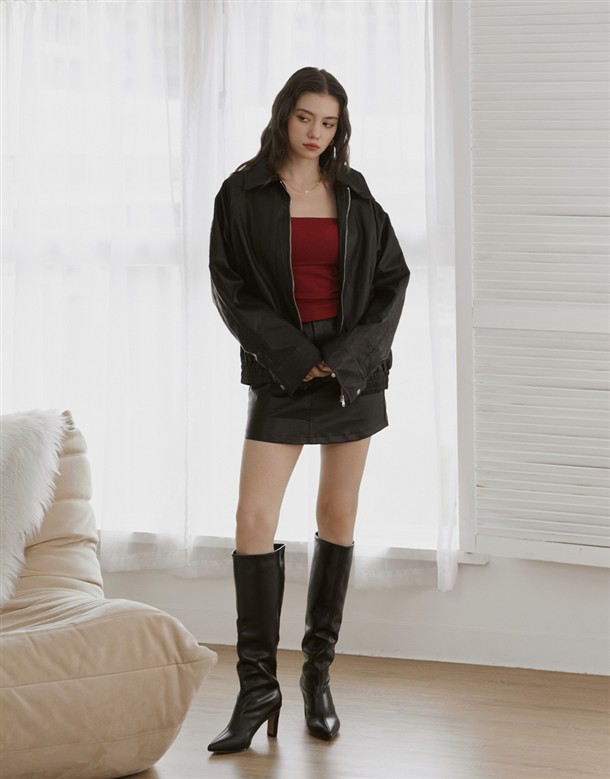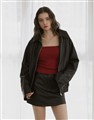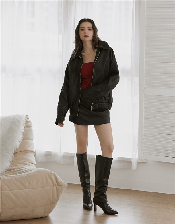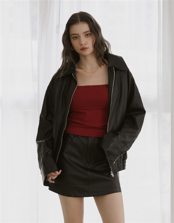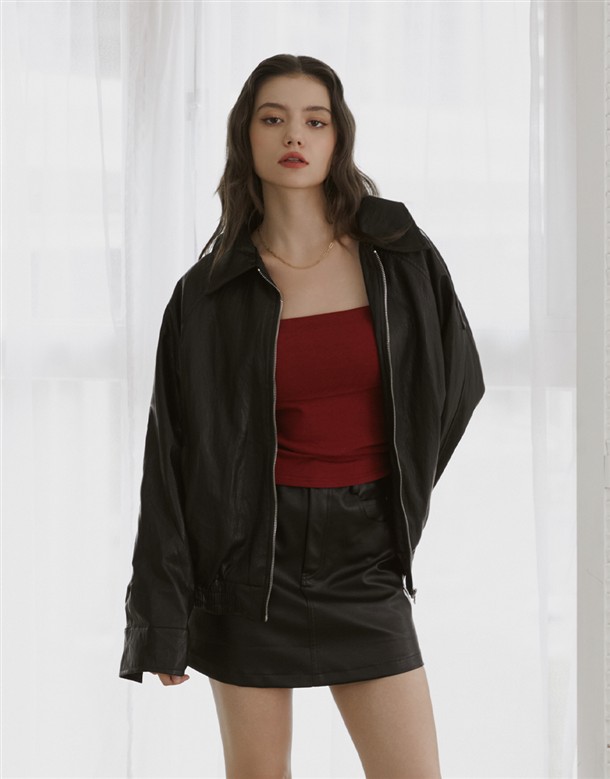 質感佳的人造皮革面料,版型寬鬆拉克蘭袖設計,有口袋,下擺做鬆緊帶