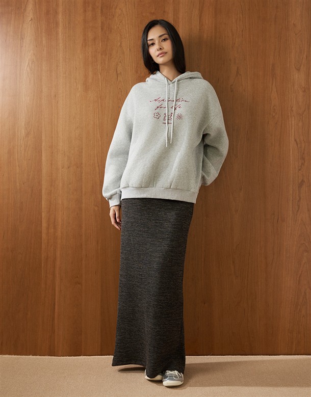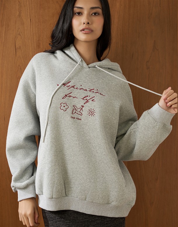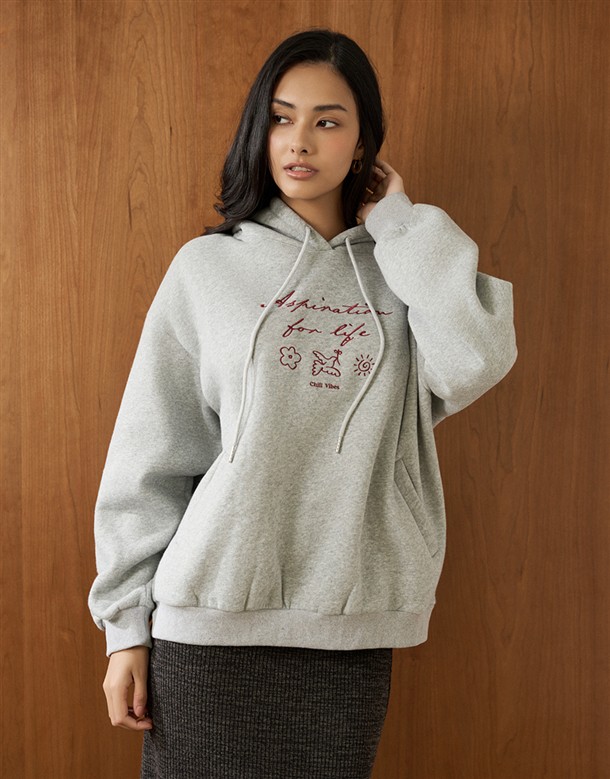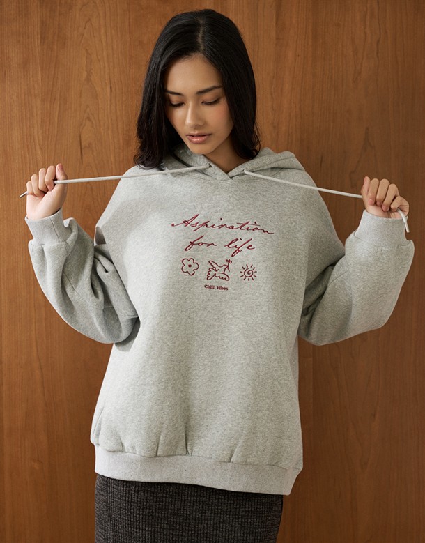 親膚內刷毛衛衣面料,版型寬鬆,標語草寫電繡圖文設計,有斜插口袋