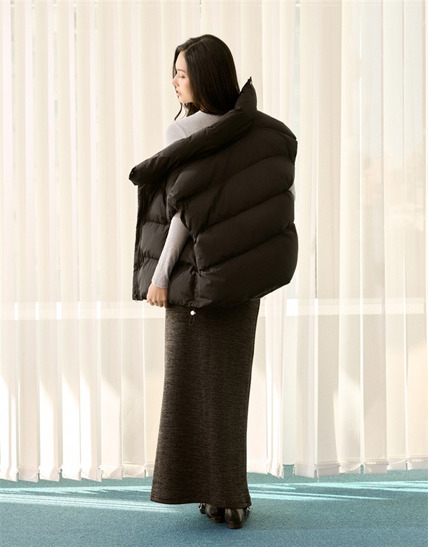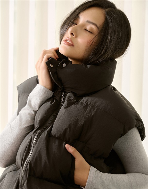 質感防風尼龍面料,保暖鋪棉夾層,寬鬆版型,可做立領或翻領,有斜插口袋,下擺抽繩設計