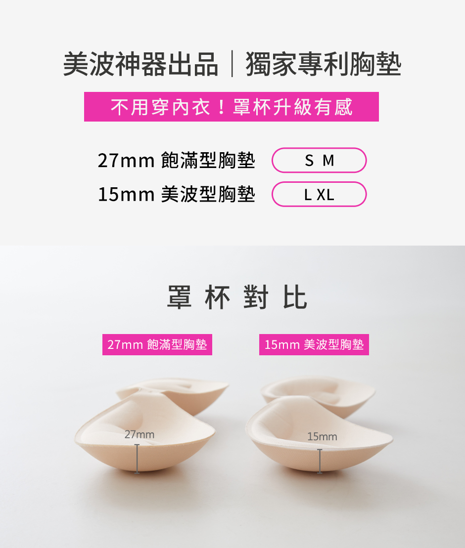3.各尺碼專屬罩杯:S~M為27mm美波型胸墊;L為15mm包覆型胸墊;XL為10mm包覆型胸墊。
