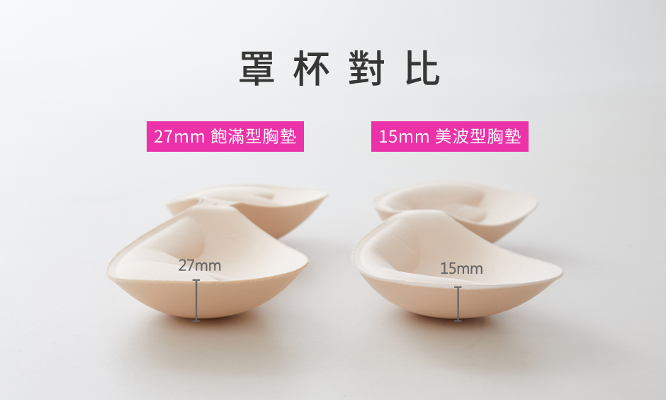 3.各尺碼專屬罩杯:S~M為15mm美波型胸墊;L為10mm包覆型胸墊。
