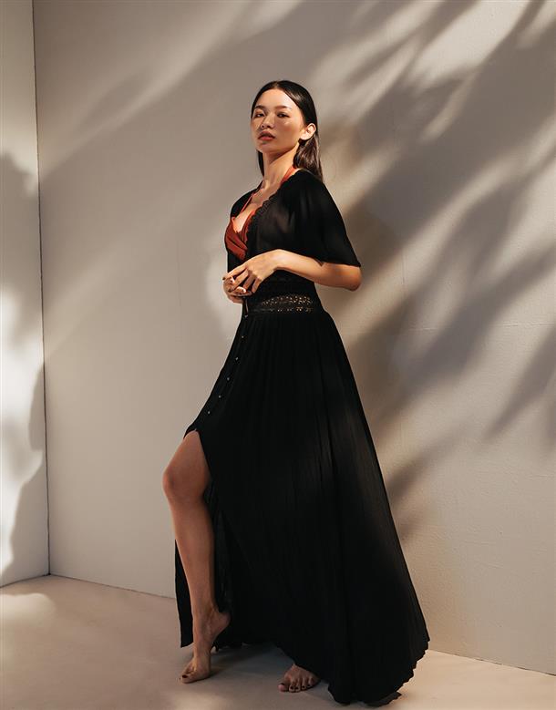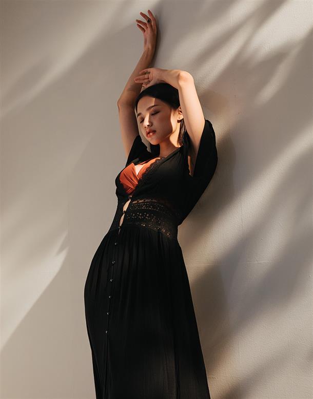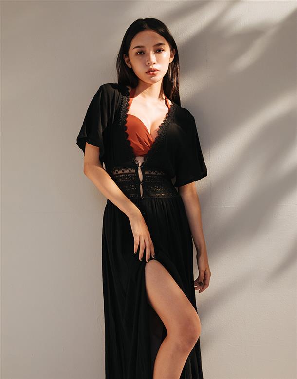 洋裝罩衫二穿式設計,氣質蕾絲與舒適人棉材質,打造飄逸女神風範。